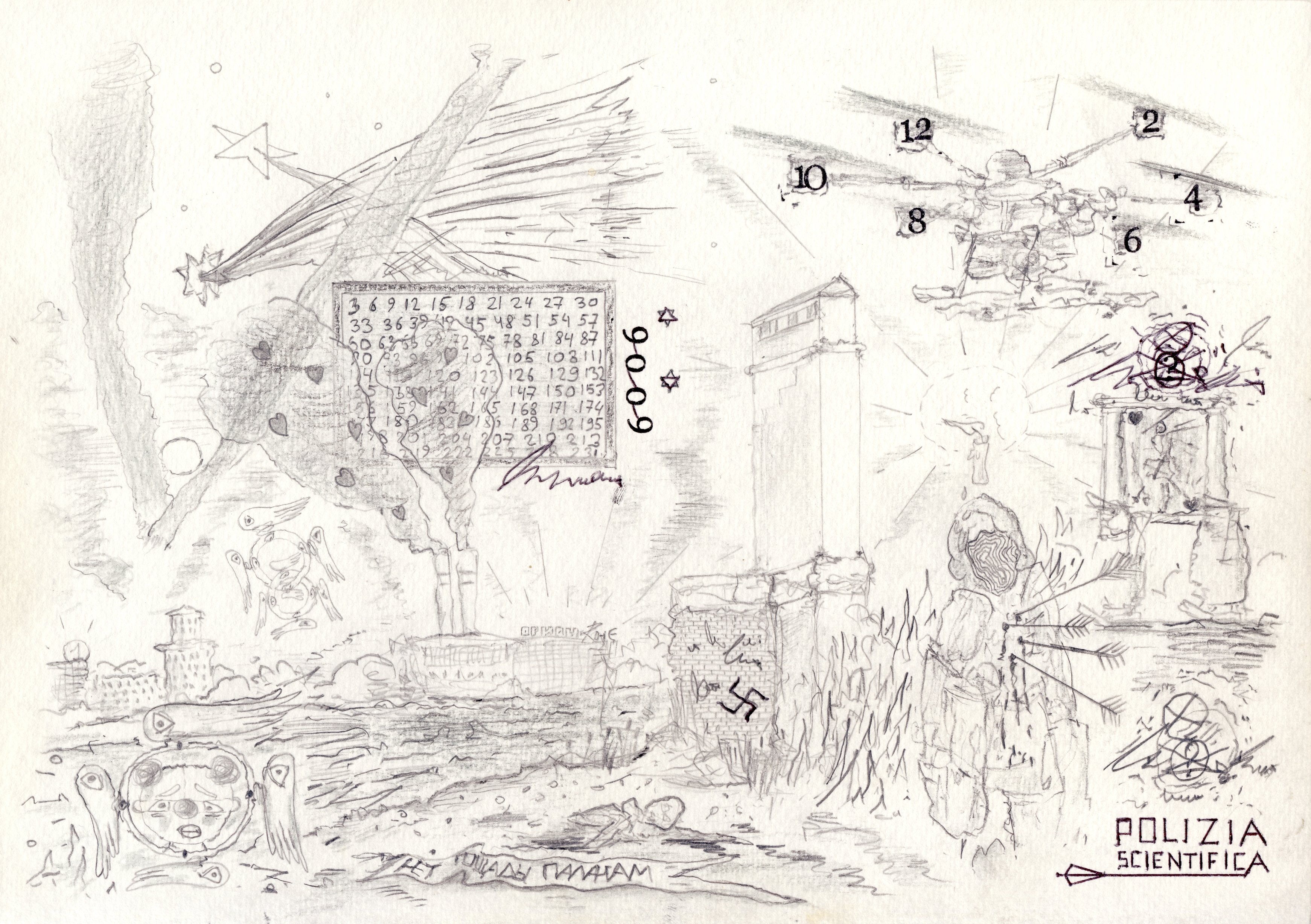 Polizia Scientifica, 2025, graphite, ink, colored pencil on 300 g/㎡ cold pressed acid-free paper, 297 × 210 mm