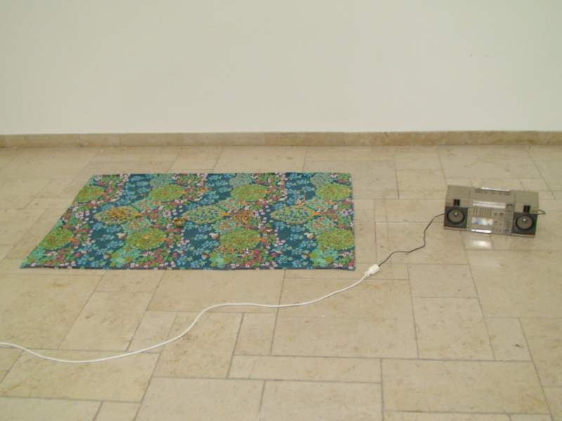 You know I like my chicken fried, a cold beer on a Friday night, a pair of jeans that fit just right and the radio up, 2011, installation at UdK Berlin, fabric, bijoux, stereo, sound