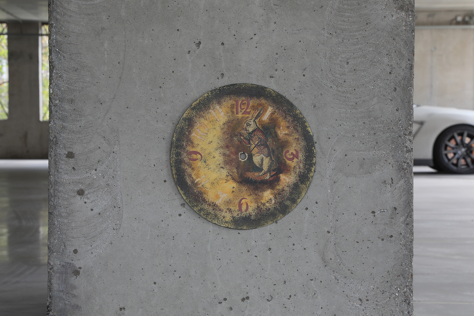 1. 36912 forever (1), 2019, decoupage on scratched fiberboard clock face, 198 × 198 × 3 mm
