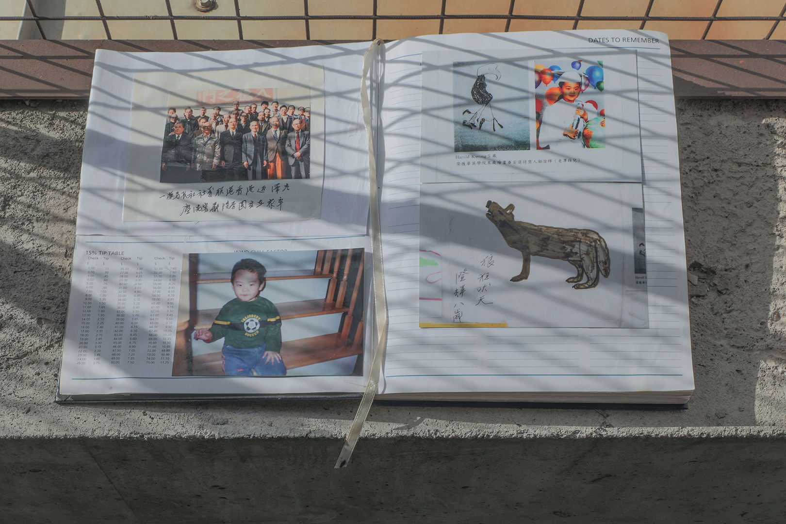 2. 2006, found circa 2016, photographs, tape, paper, ballpen on CitiBank desk diary, approx. 480 × 25 × 280 mm